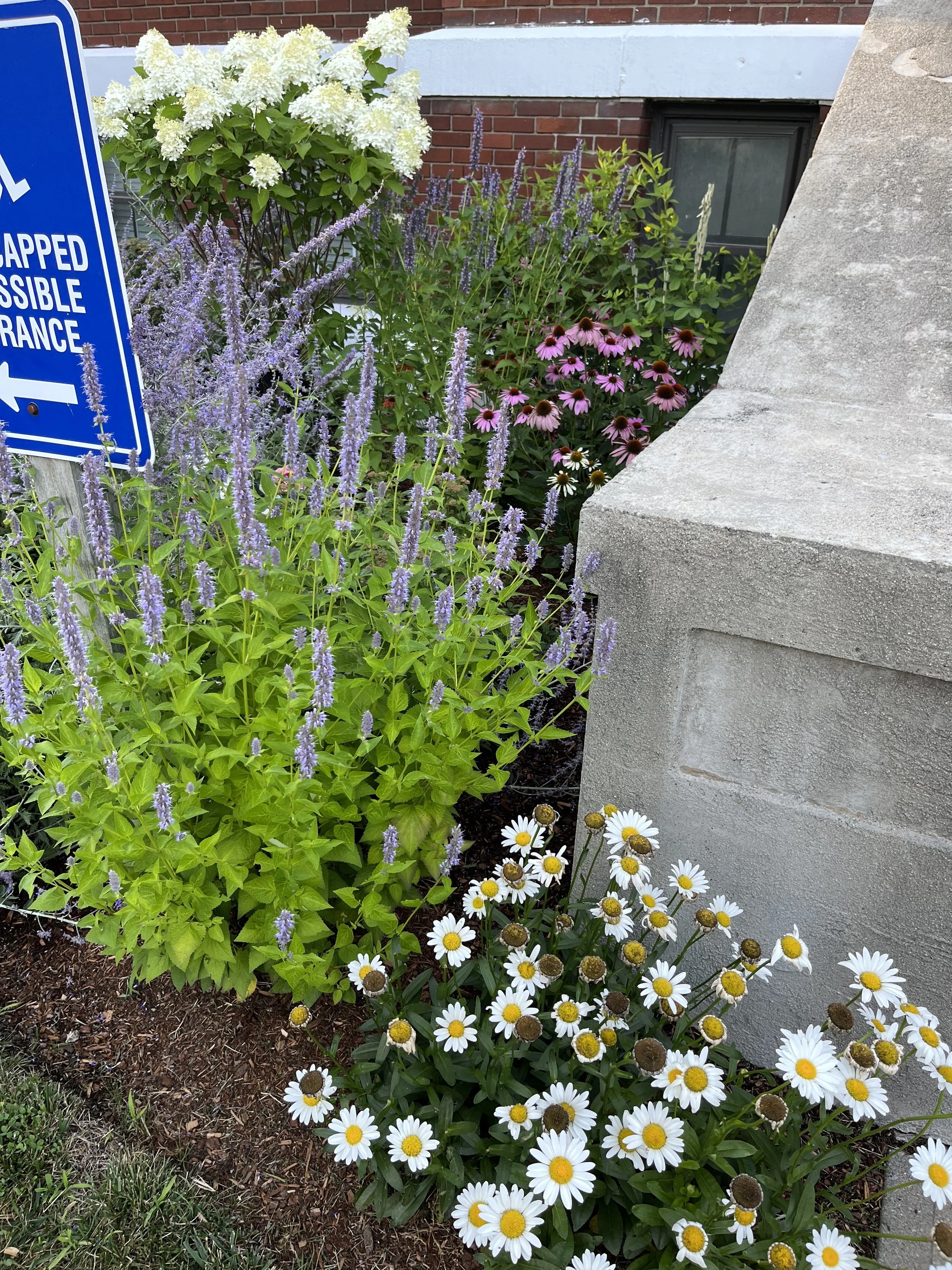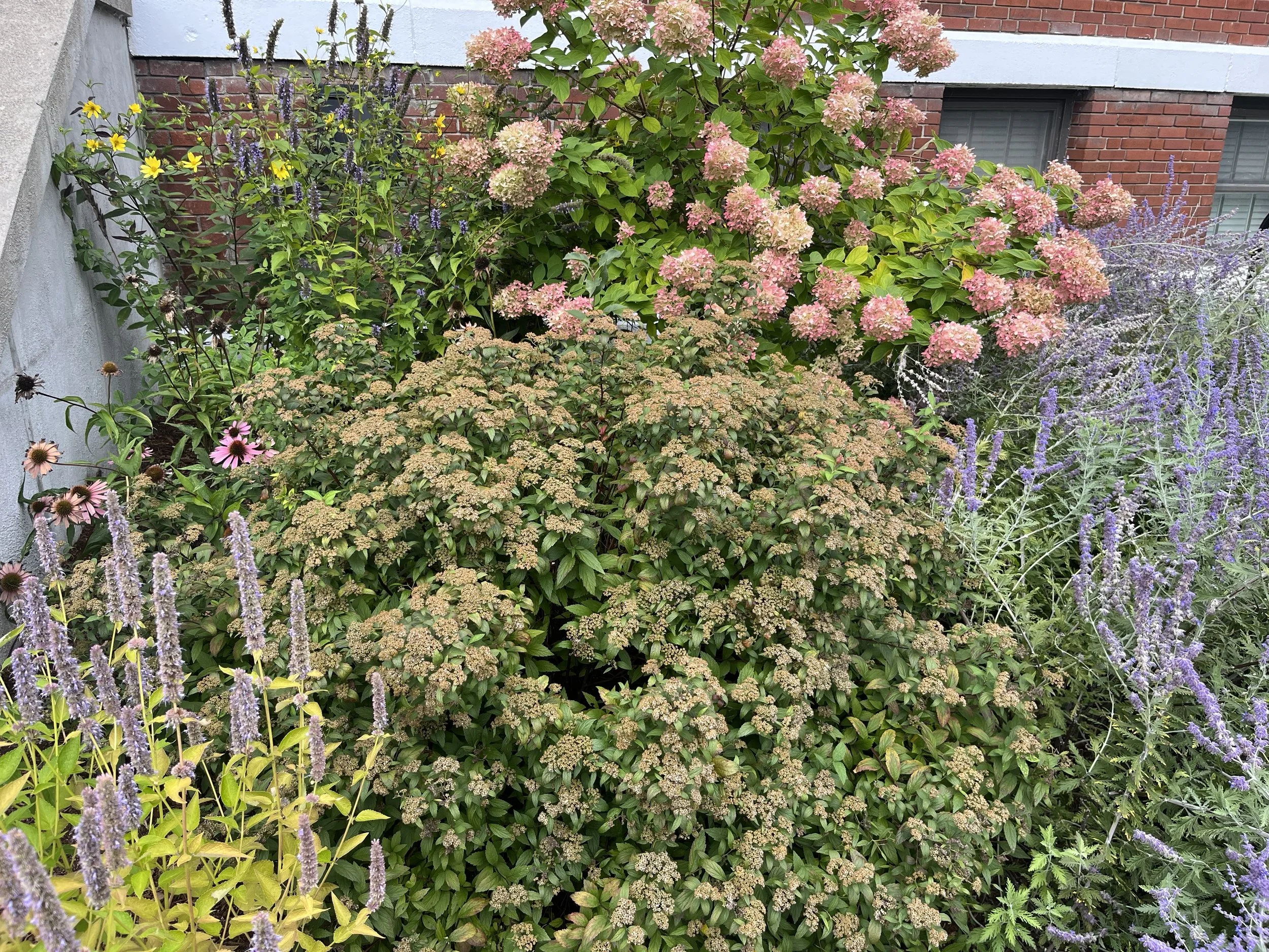 Hydrangea and Russian Sage were planted to compliment the pre-existing Spirea, followed by a mix of mostly native perennials to fill out the space and support pollinators. Great results in this dry, full-sun urban location.