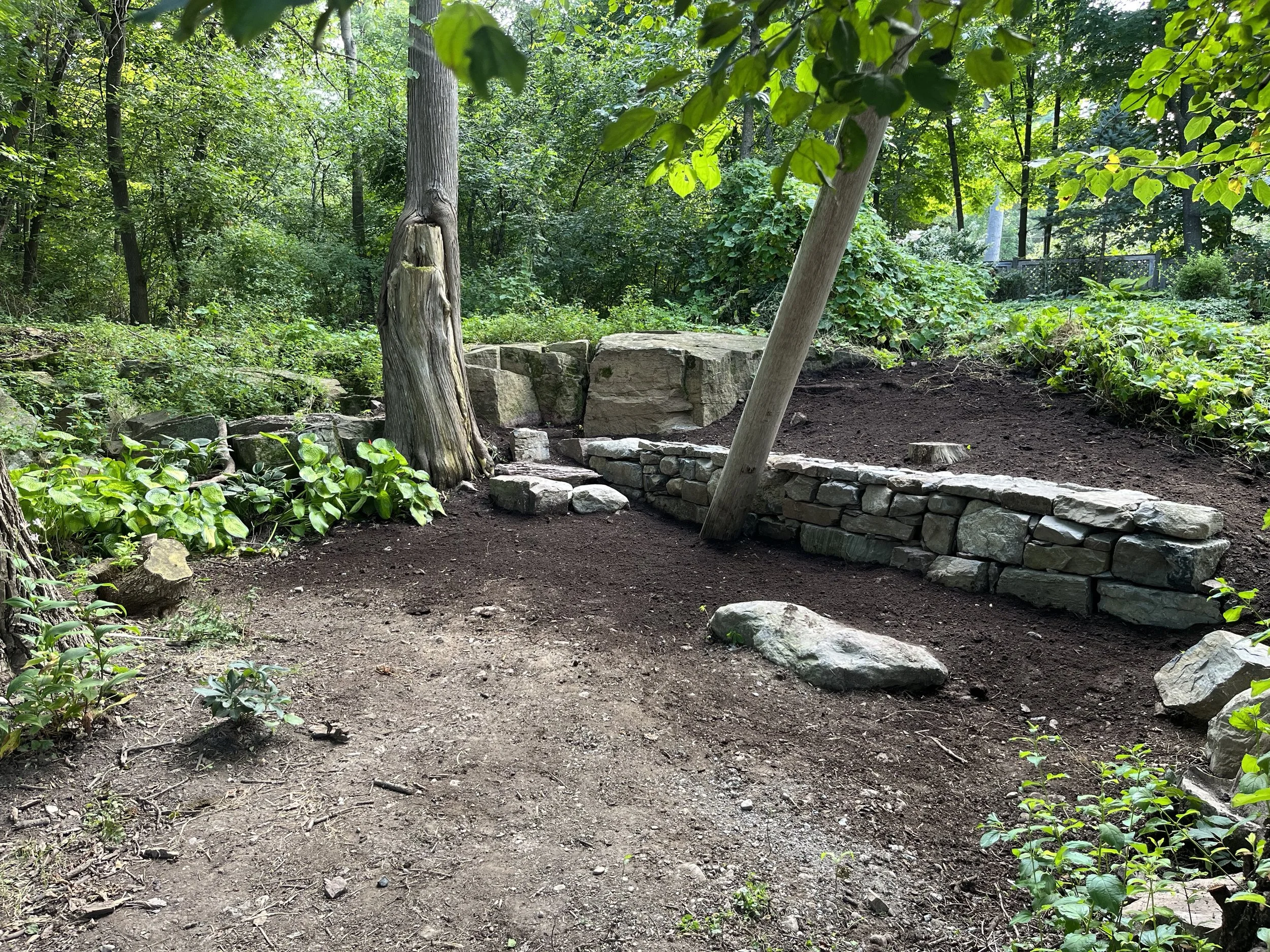 A hefty drystone wall tucked between a gorgeous outcropping and an unsightly utility pole. All of the stone was unearthed during site prep on other parts of the property. The wall compliments a subtle scattering of native perennials in this woodland “garden” space.