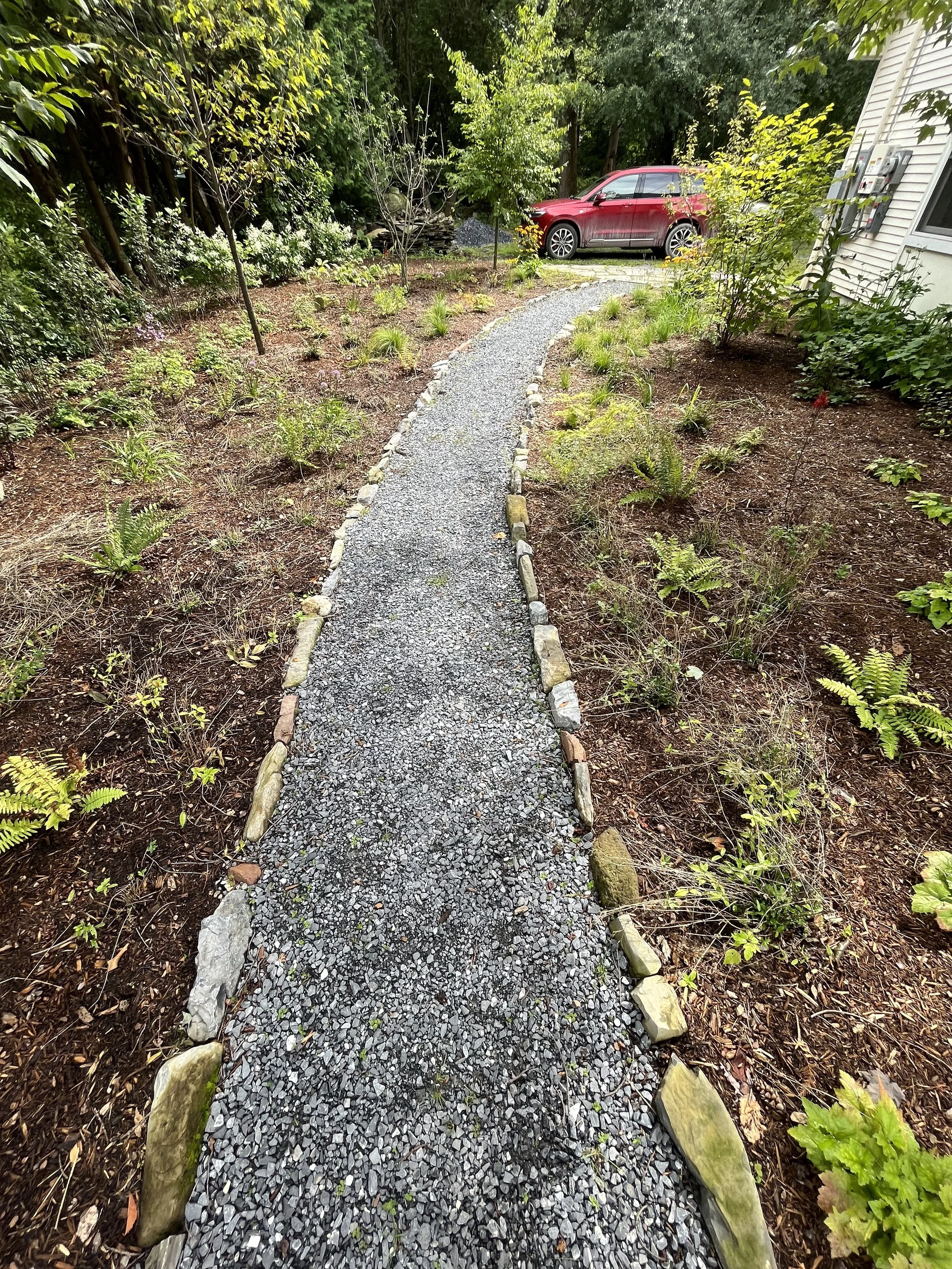 Some hardscape touches after a massive planting effort designed by Dicot Land Studio and installed by Dicot, Broadleaf, and Faber LD. This bluestone “landing pad” and cobble-bordered walkway provide accessibility and flow to a historic lakeside property.