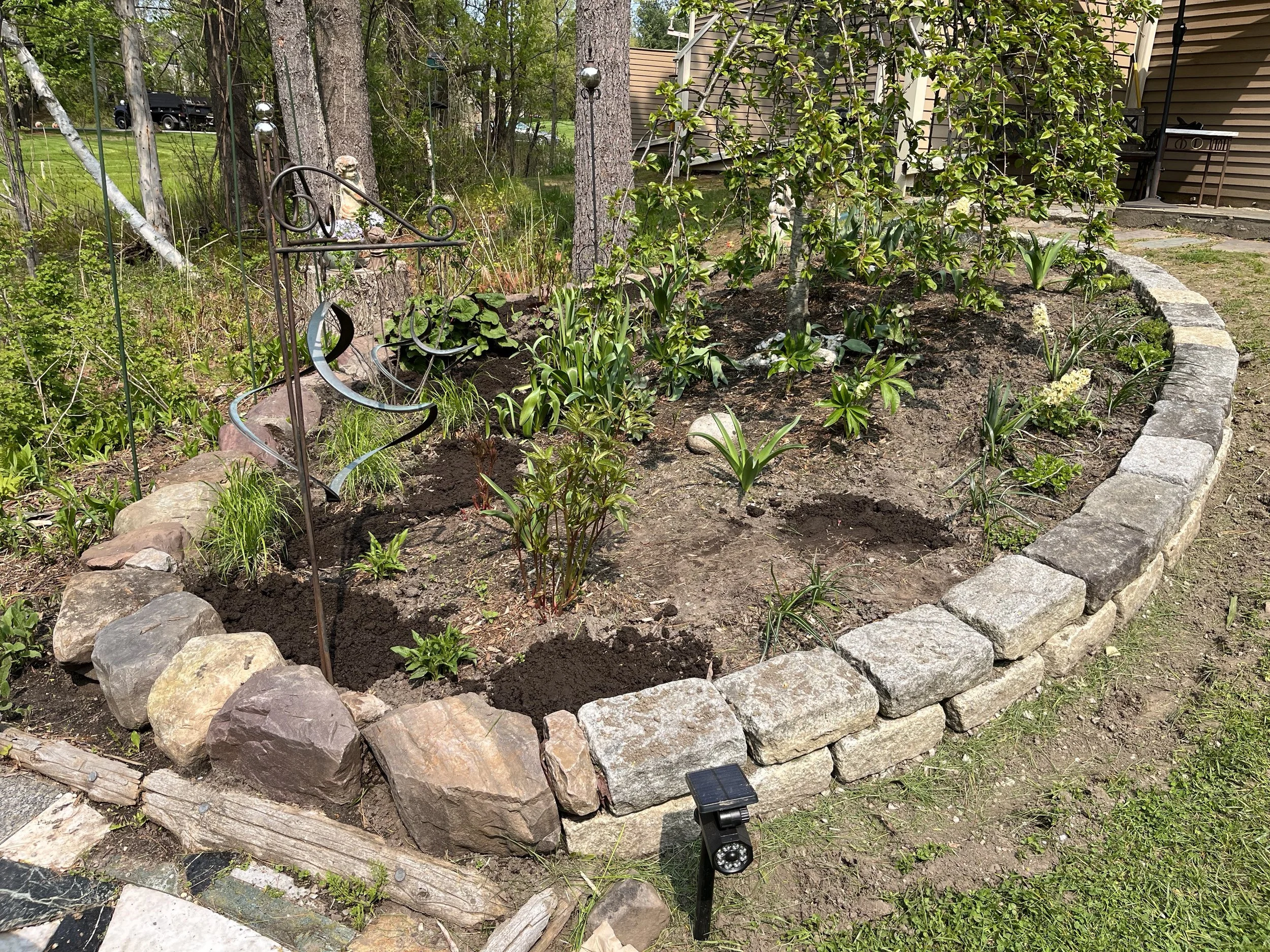 Mixed native & ornamental garden with drystacked field stone and solid belgian block retaining walls