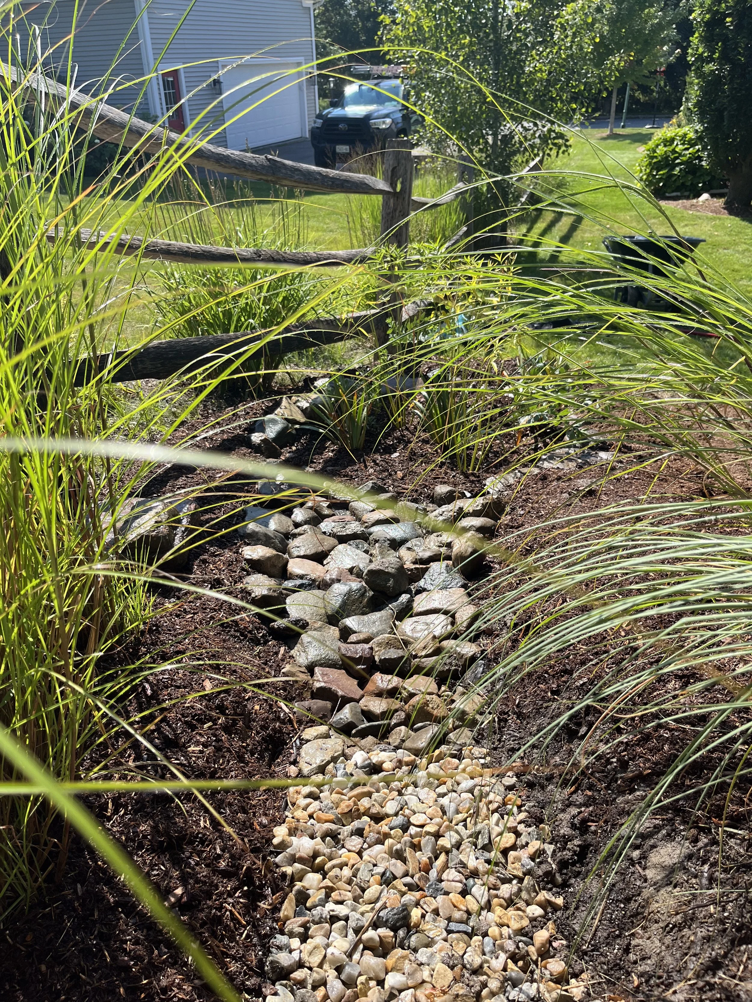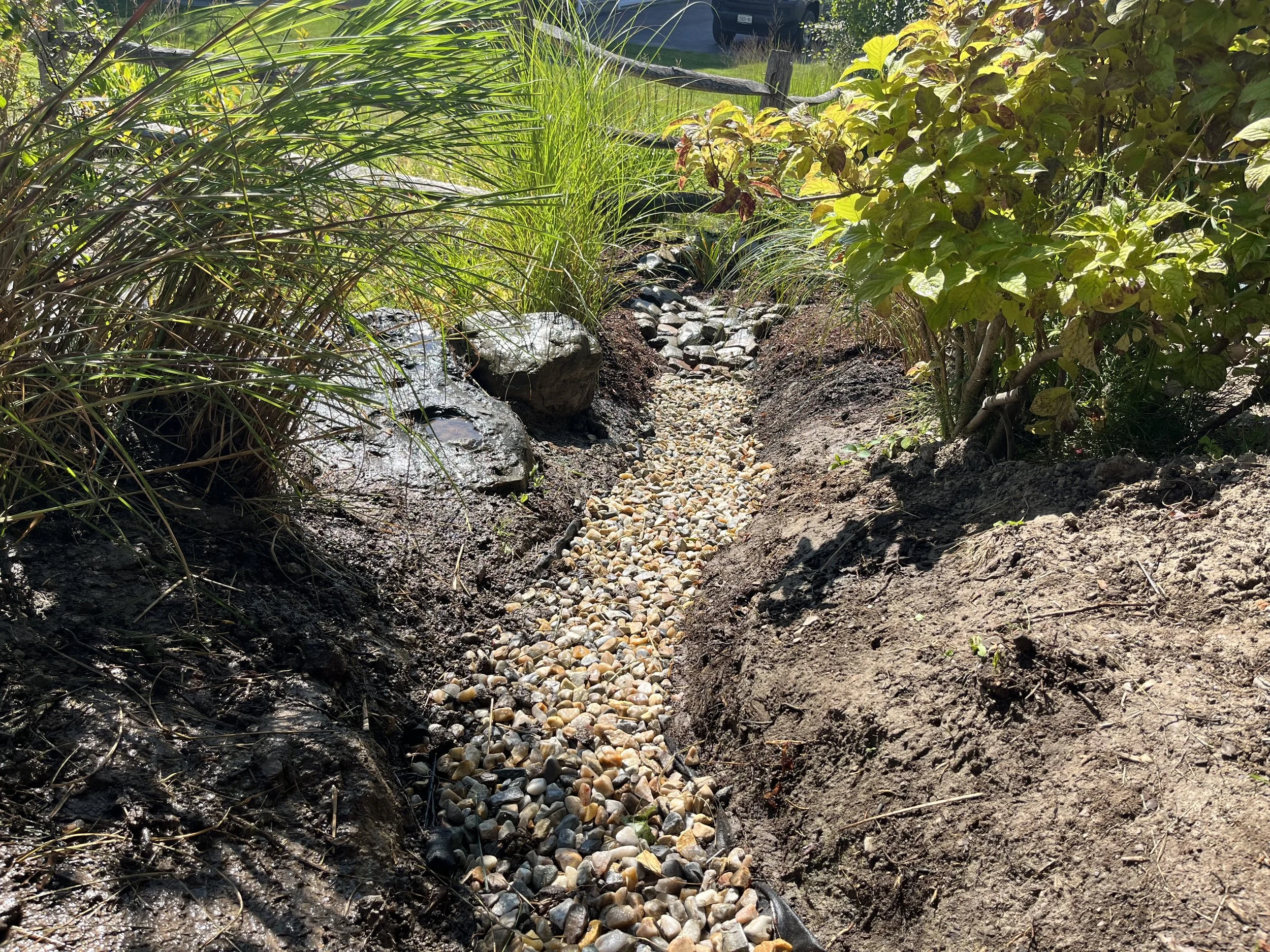 Stone swale & drainage basin / native rain garden